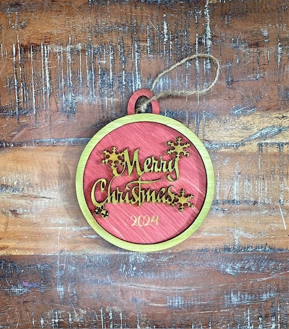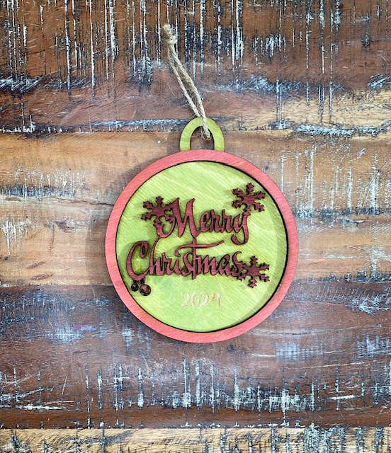 Merry Christmas Ornaments. Approximately 4.5" x 4.5" in size. Variant 1 Red Letters. Variant 2 Green Letters.
